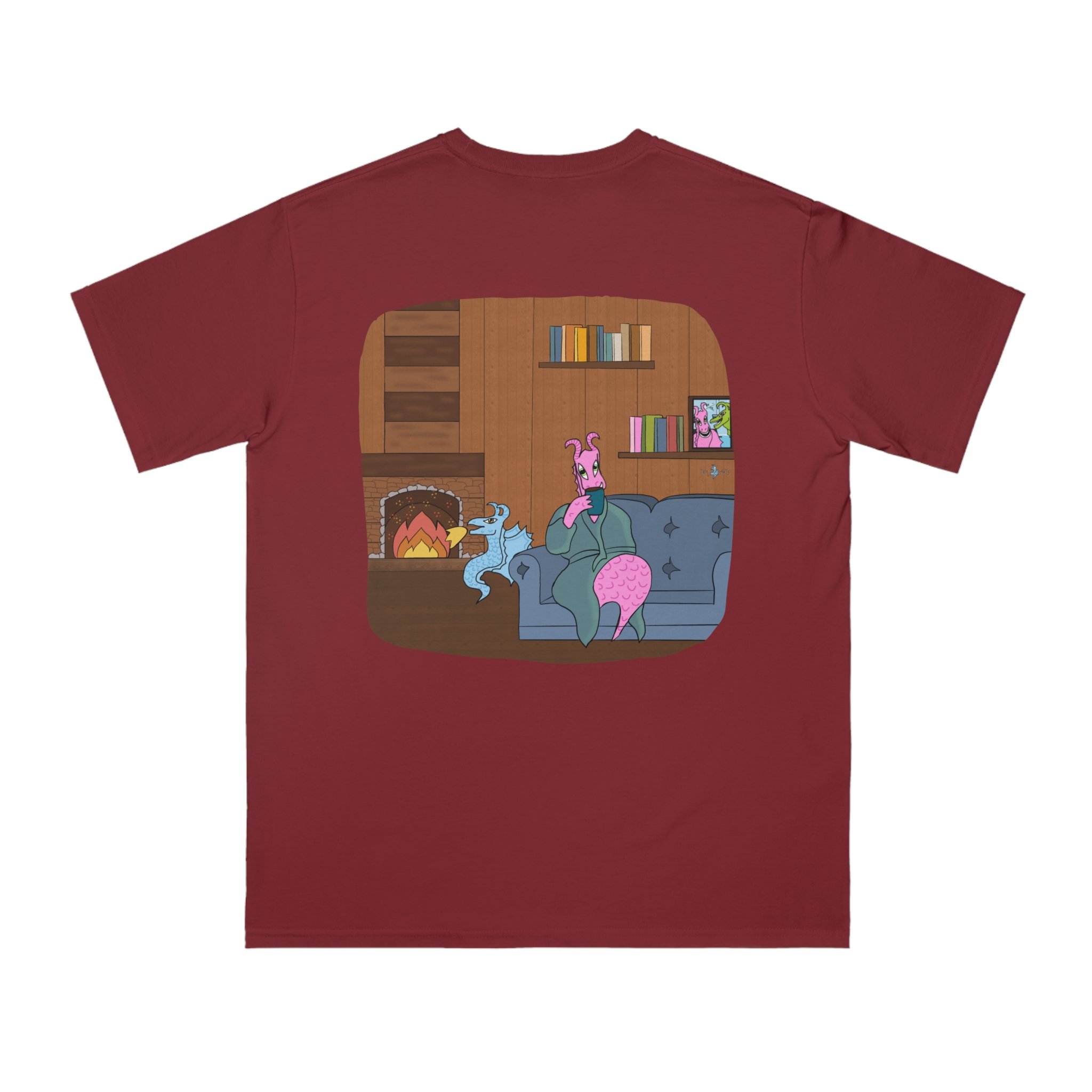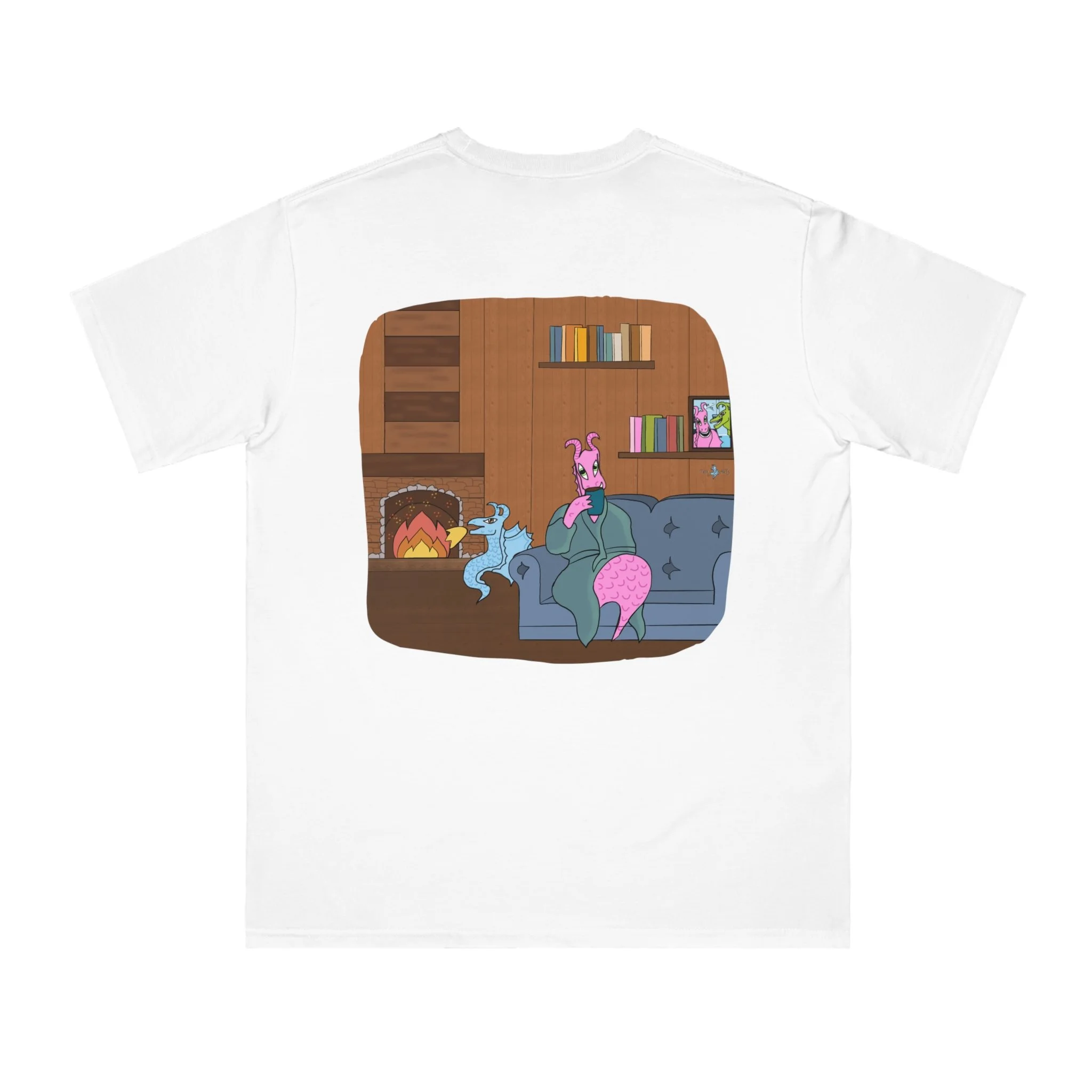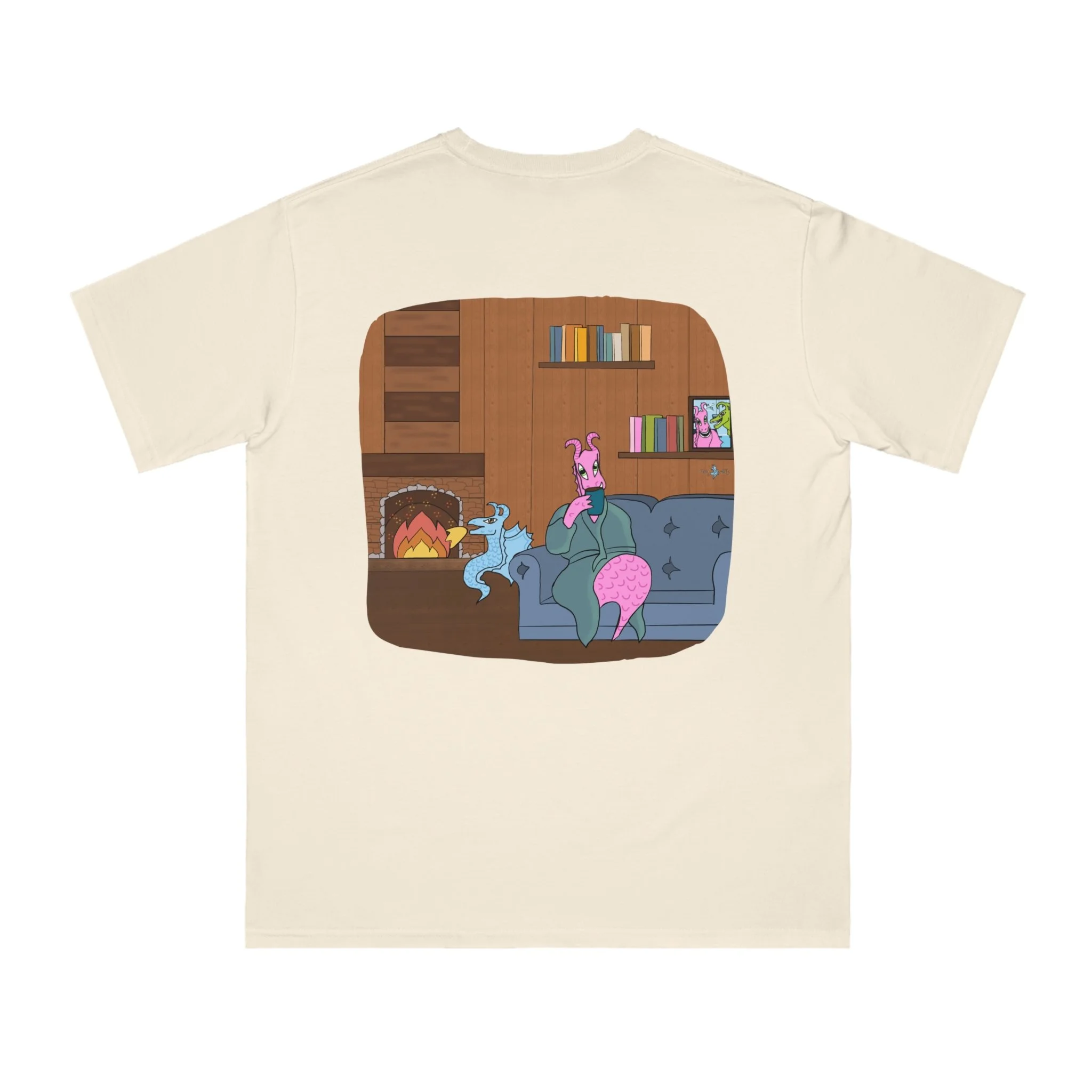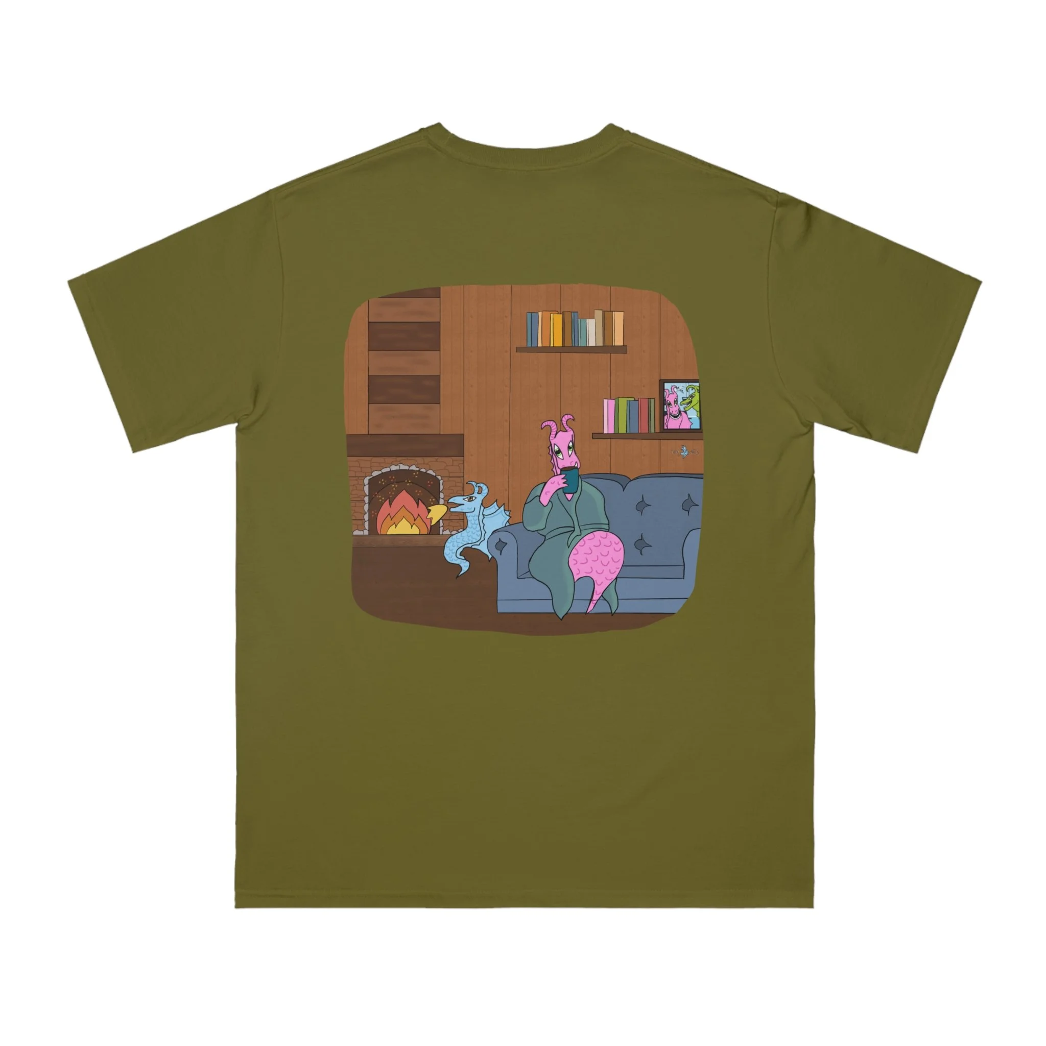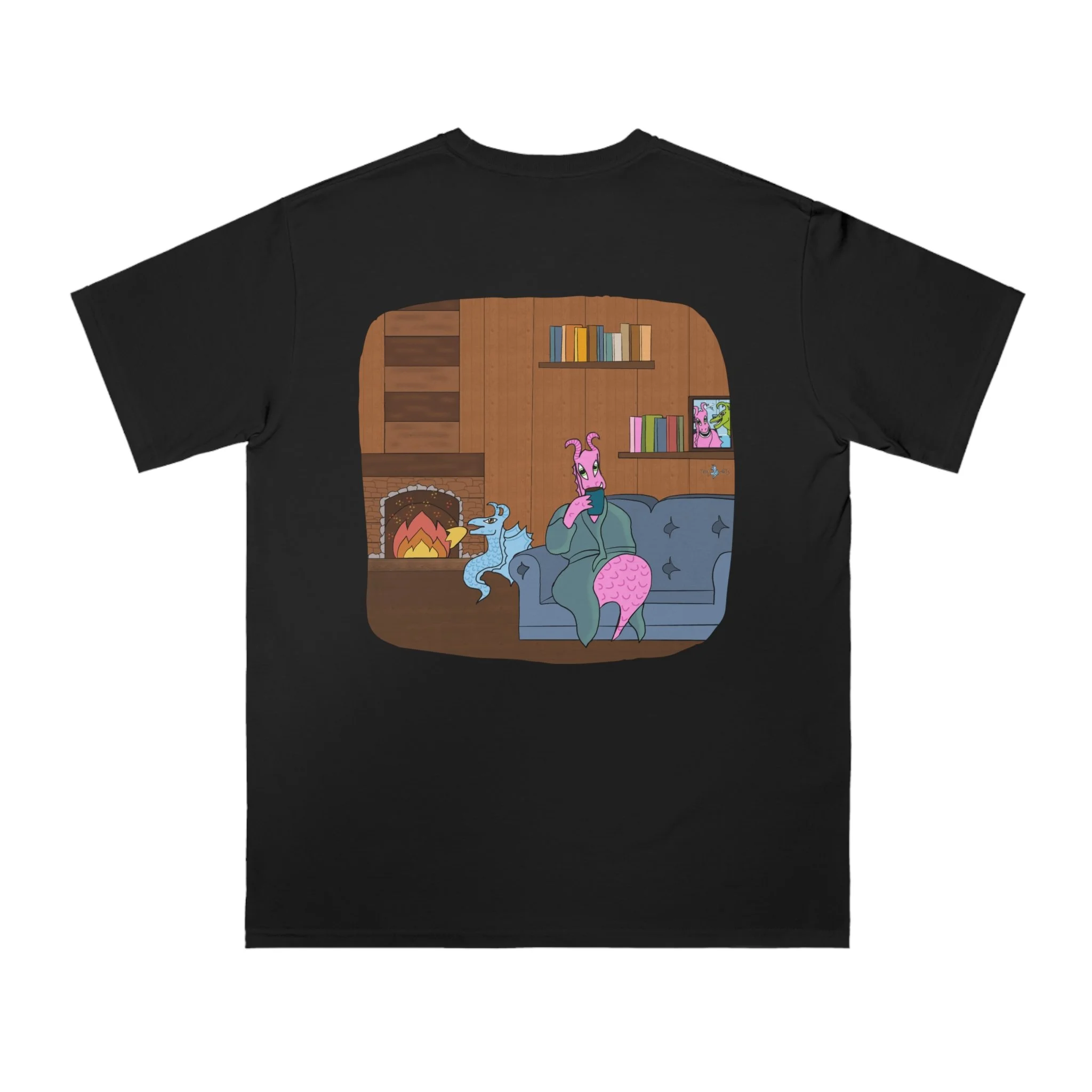A soft, organic cotton tee that wraps quiet mornings and cozy evenings into wearable comfort. The front keeps it subtle with a small chest phrase, while the back opens into a warm illustrated scene: two whimsical dragons lounging by a roaring hearth in a wood-paneled room, books on the shelf and a gentle glow that feels like an invitation to slow down. It sits at the natural intersection of comfort and personality — breathable, gently insulating, and relaxed in shape so it layers easily under a jacket or stands on its own when you want to linger at home with coffee or read until the light fades.