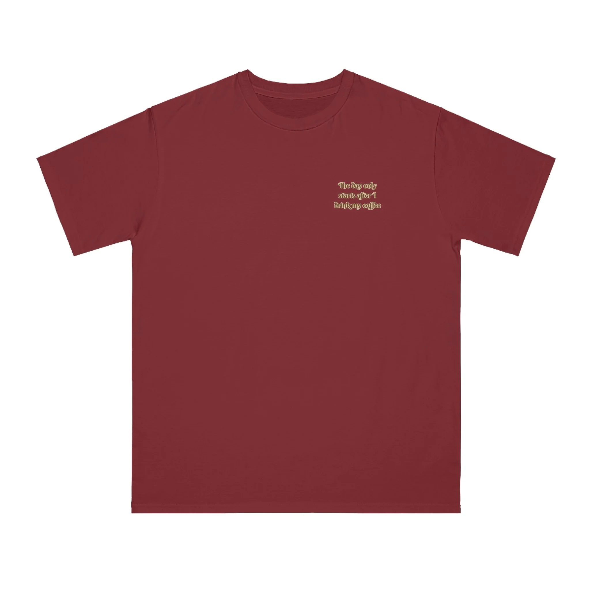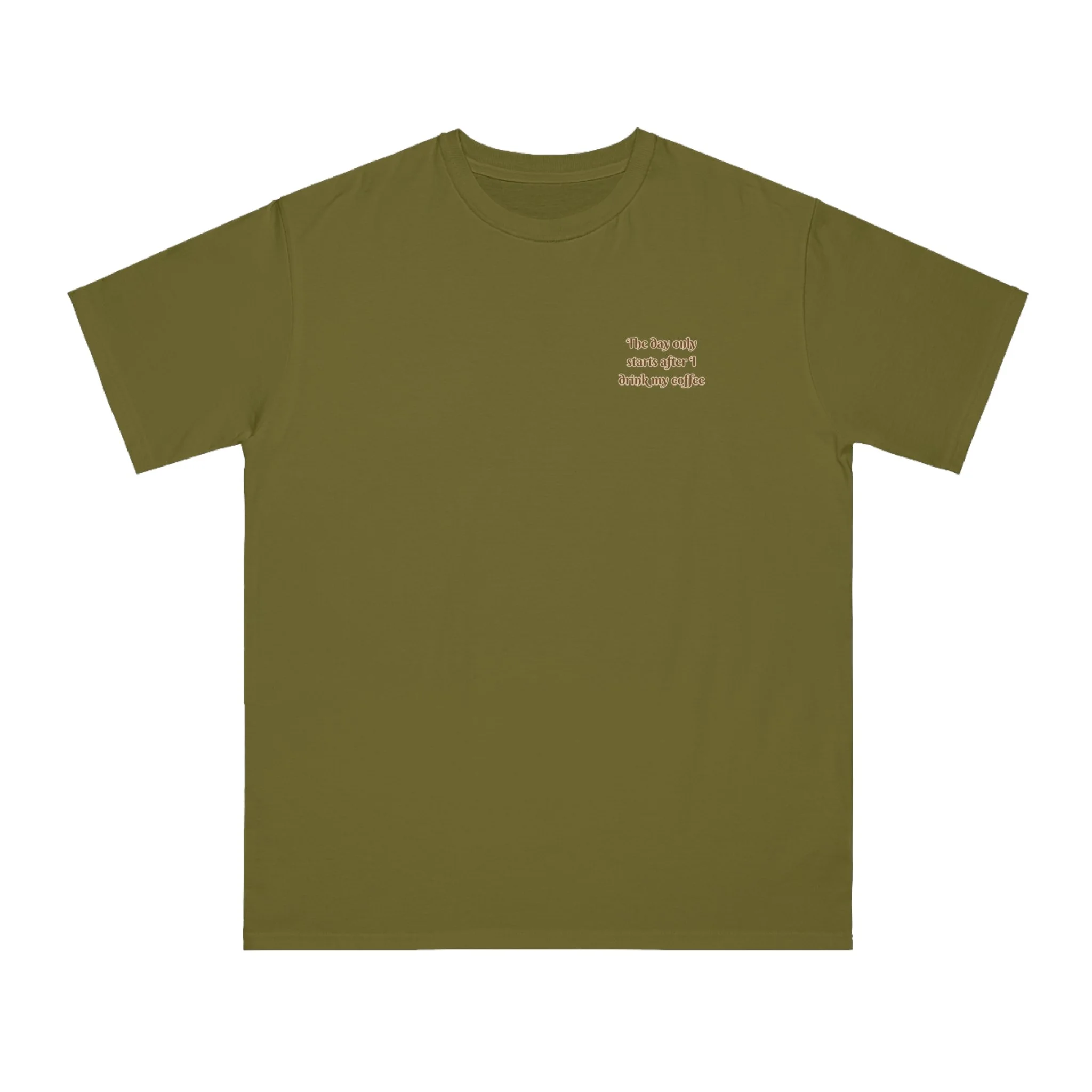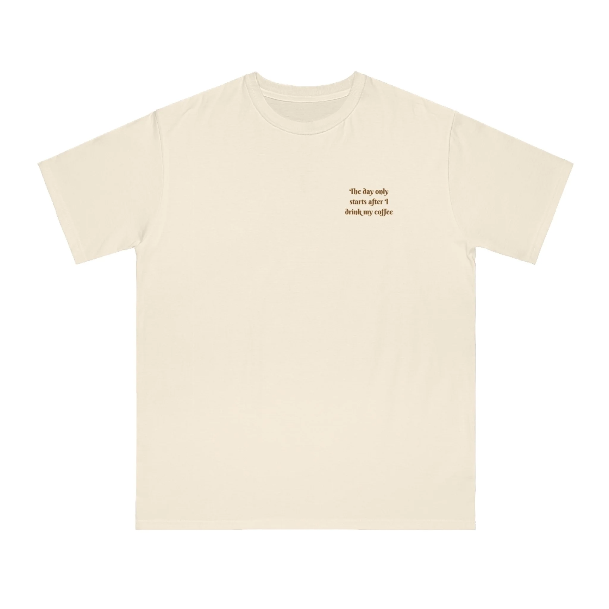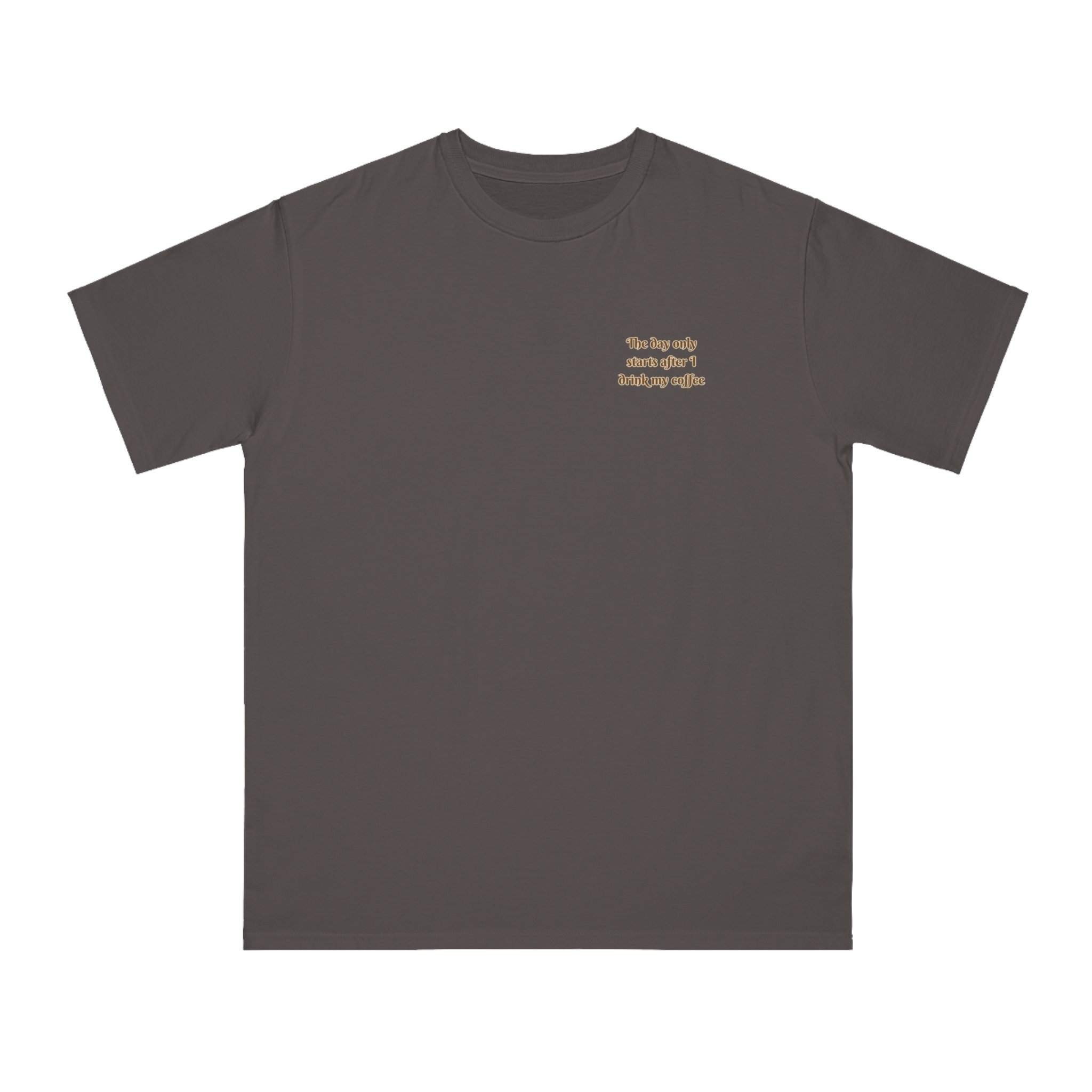 Cozy Cabin T-Shirt — "The day only starts after I drink my coffee" Graphic Tee
