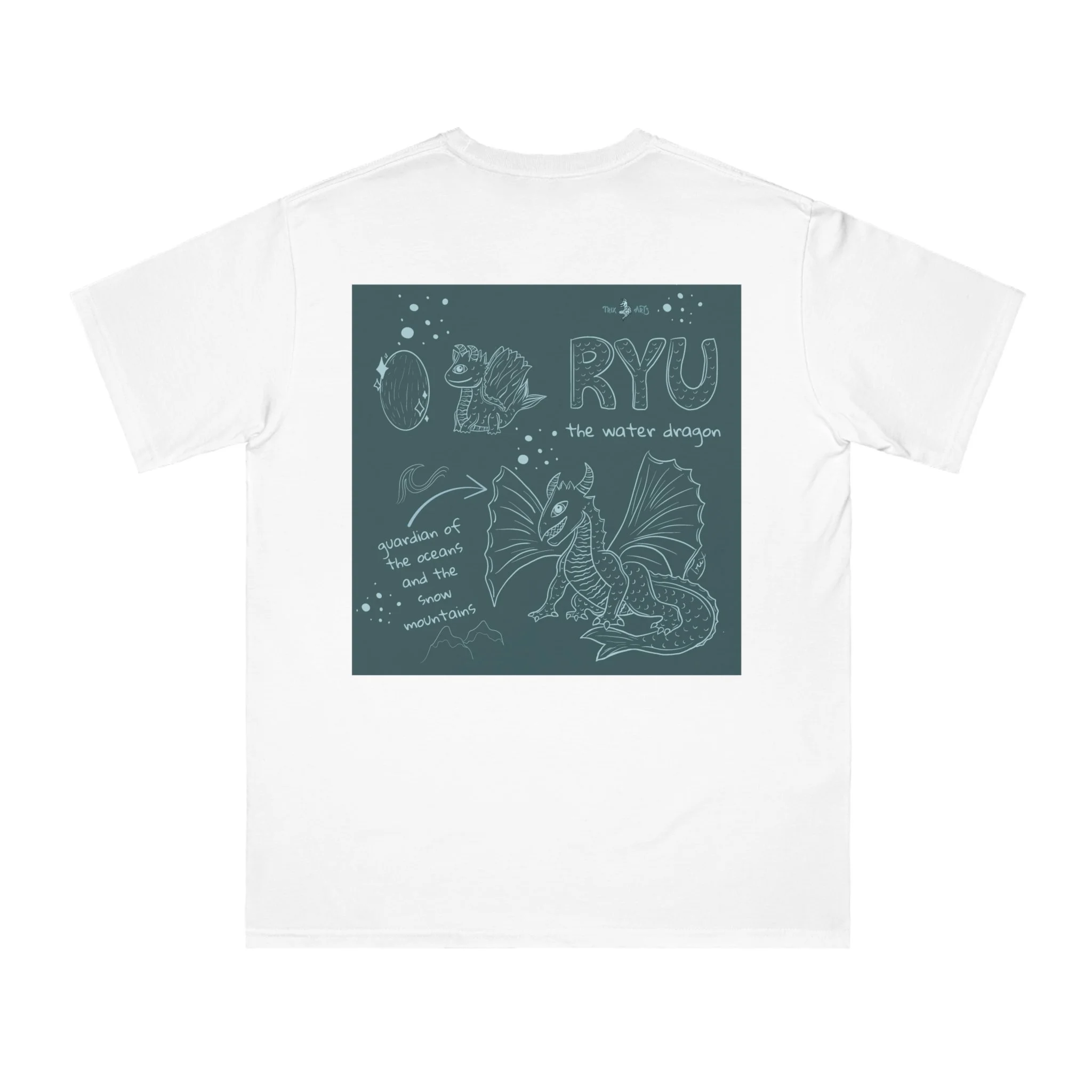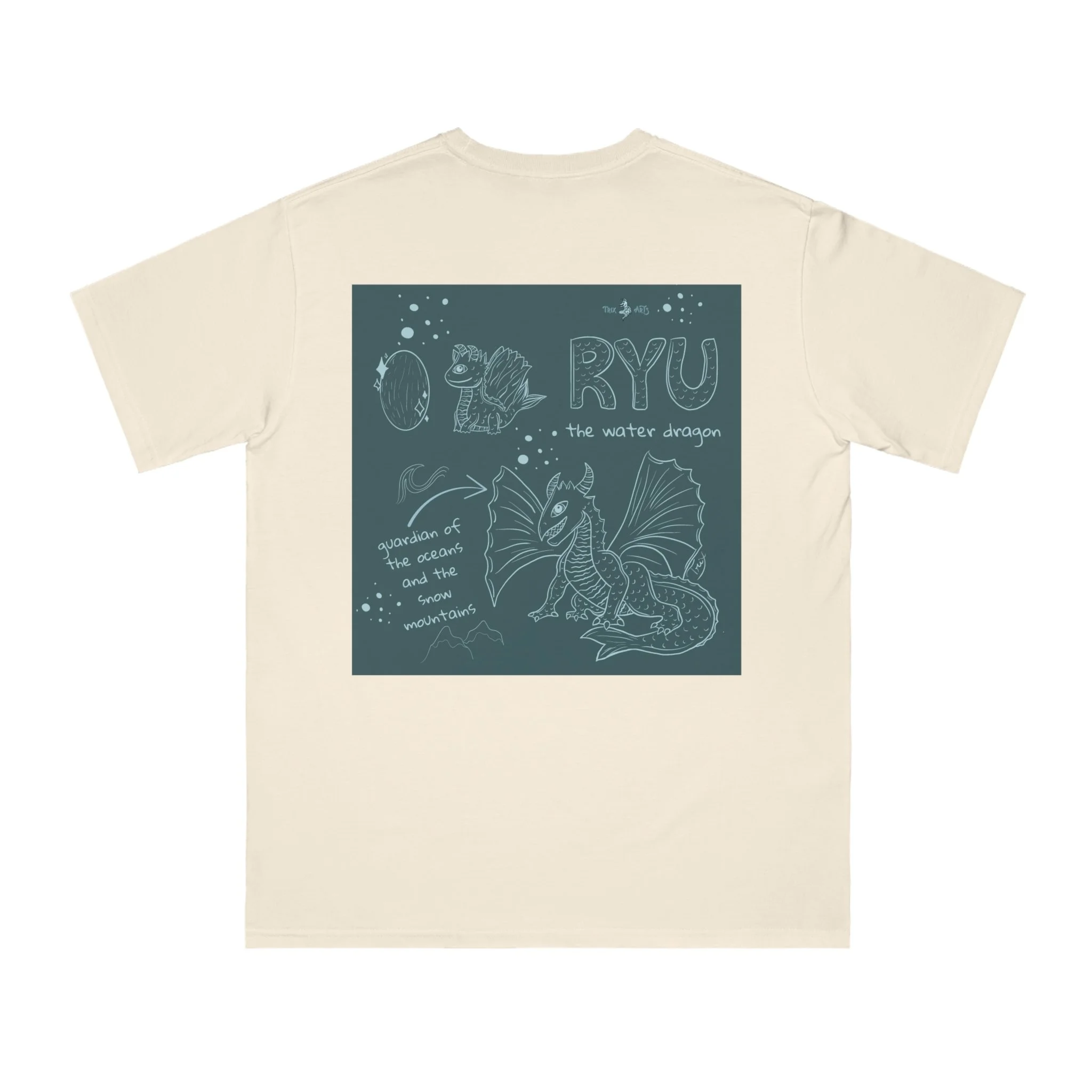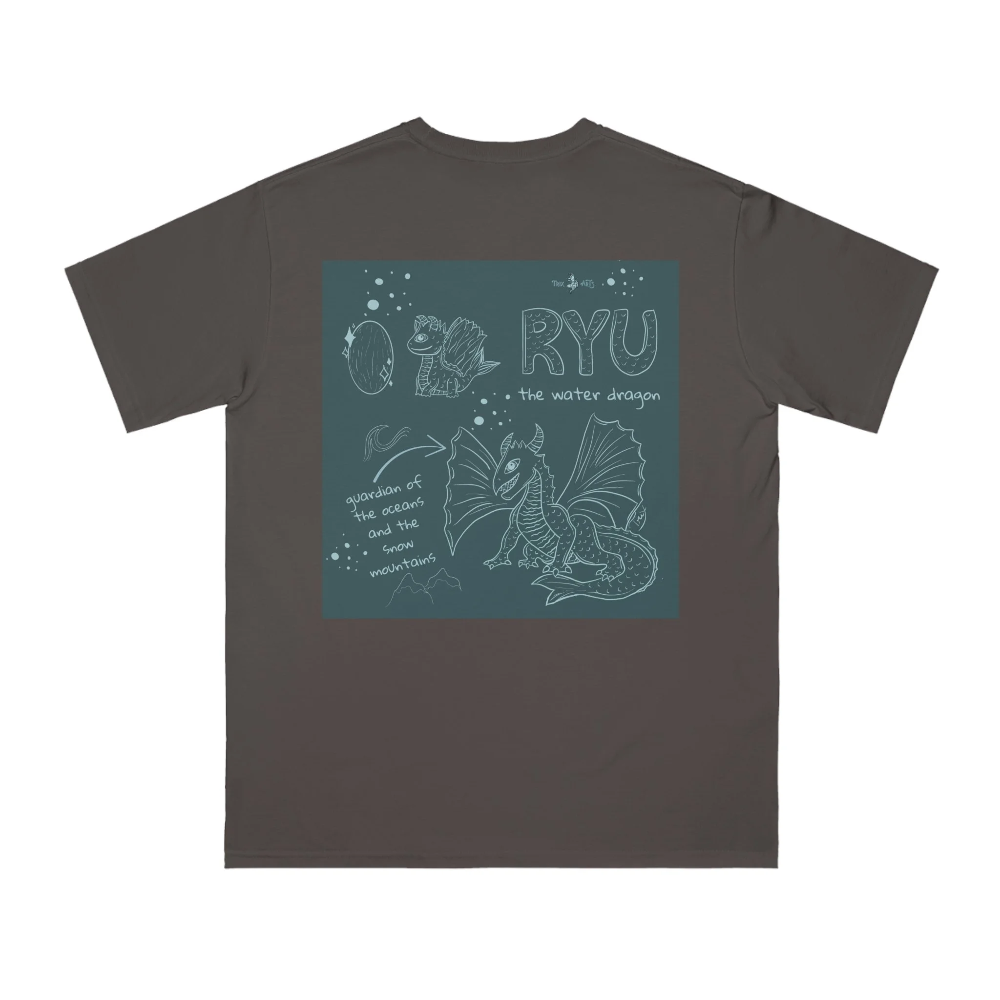 A soft, organic cotton tee drawn in muted, earthy tones that feels like a quiet conversation with folklore. The front carries a small, understated line of text; the back opens into a hand-drawn scene of a gentle dragon, sketch notes, and celestial doodles. Wear it on slow mornings, road trips, or at meetups with fellow storytellers — it layers easily under jackets or stands alone as a calm statement piece. The breathable midweight fabric and relaxed cut keep movement easy while the tear-away label and sturdy collar make it feel thoughtful every time you pull it on.